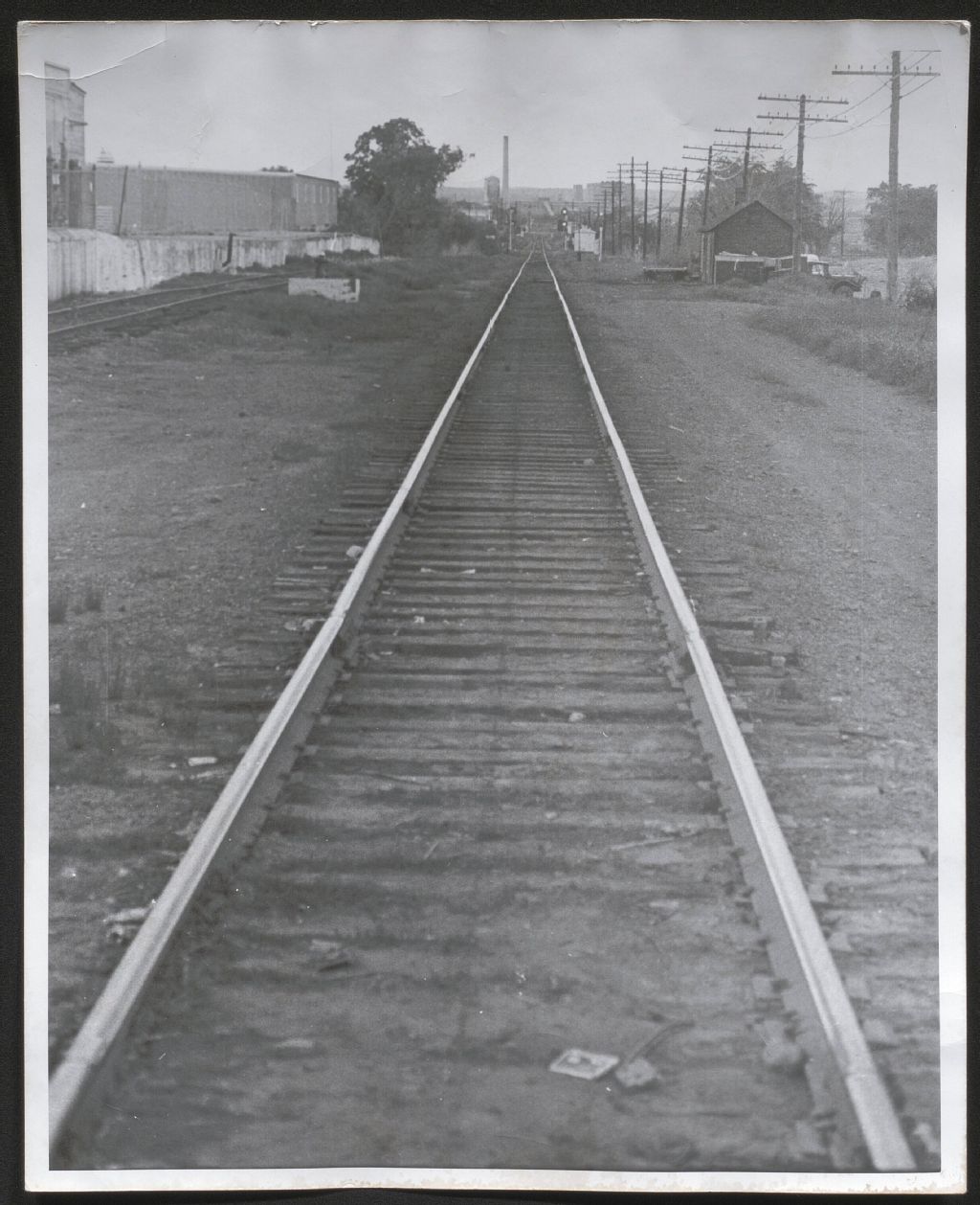 Voie de chemin de fer. À droite, on voit un véhicule à moteur et une cabane, peut-être une dépendance d'une compagnie de chemin de fer. Au bout de la voie ferrée, une ou des usines, Lieu indéterminé.