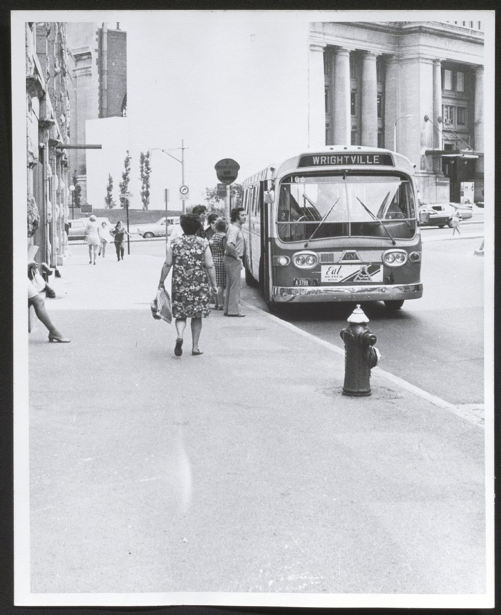 Autobus de marque General Motors (GM), de la Commission de transport de la Communauté régionale de l'Outaouais, rue Mackenzie à Ottawa. .L'autobus affiche « Wrightville » comme destination. À gauche, l'édifice Daly qui a été démoli en 1991-1992. En arrière-plan, à droite, l'ancienne gare Union devenue un centre de congrès.
