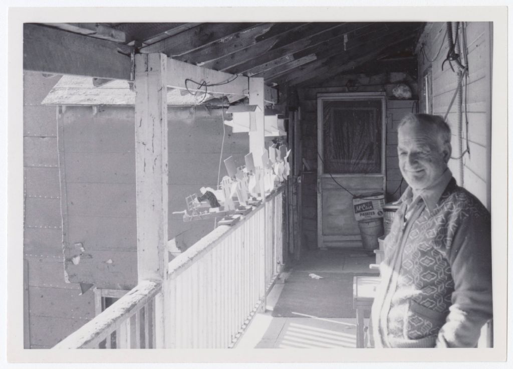 - Homme debout sur une galerie devant ses sculptures sur bois placées sur un garde-fou. Les sculptures sont des cabanes à oiseaux et des bonhommes, qui scient une buche, actionnés par un vire-vent. Au dos de l'une des photos les inscriptions suivantes : AGIH/RCCH.