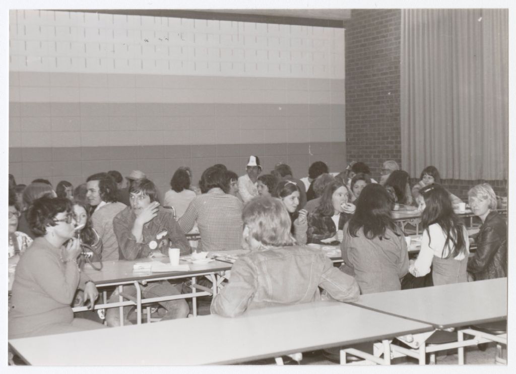 Personnes attablées dans un gymnase, [1970-1979], Archives nationales à Gatineau, Fonds Roger Poirier, (07H,P134,S6,SS3,D8,P8), Photographe non identifié.
