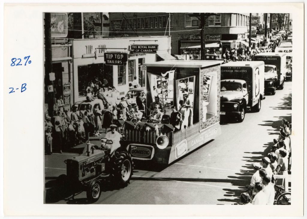 Défilé rue Principale à la hauteur de la rue Laval à Hull. On voit un char allégorique, tiré par un tracteur agricole, sur lequel joue un orchestre commandité par la Canada Packers, suivi de deux camions de la Canada Packers et autres véhicules. De chaque côté de la rue, de nombreux spectateurs. En haut, à gauche de la photo, le magasin Tip Top Tailors, suivi par The Royal Bank of Canada. En haut, presque au centre de la photo, le magasin Jack Snow situé à l'angle de la rue Laval. À l'endos de la photo : Archives du Q à Hull.