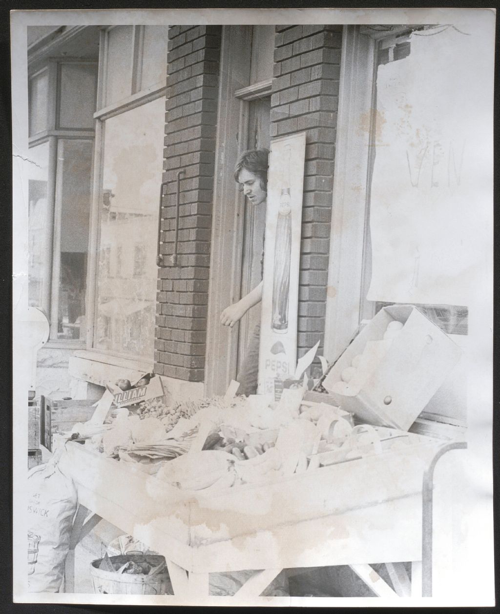 Étal de fruits et légumes devant une épicerie d'où sort un jeune homme. Photo possiblement prise à Hull, rue Eddy.