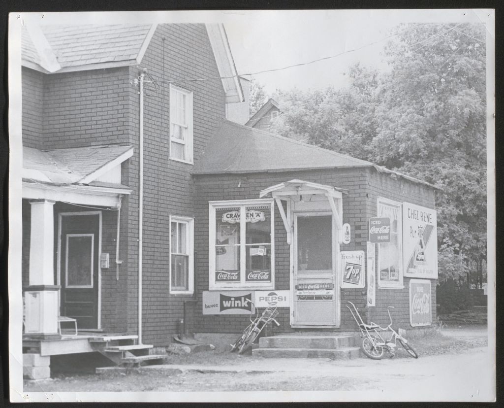 La photographie montre une maison de Hull vue de l'extérieur. Une partie de la maison abrite un dépanneur. Un des panneaux accrochés aux murs de la maison indique « Chez Rene », tandis que de nombreuses autres affiches publicitaires font la promotion de diverses compagnies de boissons gazeuses. Deux bicyclettes sont accotées sur le perron du dépanneur.
