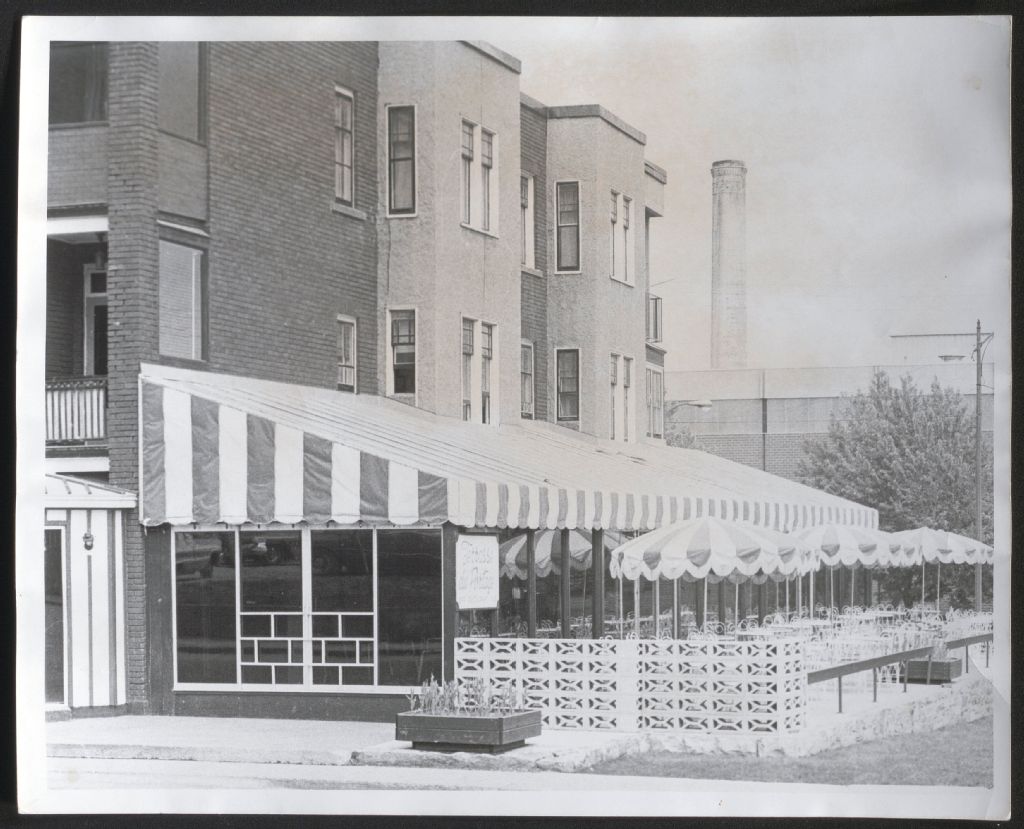 La photographie montre la grande terrasse extérieure du club Terrasse du Portage situé au 66, rue Notre-Dame à Hull. Un panneau accroché sur l'une des fenêtres indique: « Terrasse du Portage, Bar - Restaurant - Pub ». Plusieurs parasols sont disposés autour des nombreuses tables blanches. Deux bacs à fleurs sont placés aux abords de la terrasse. En arrière-plan l'usine de la papetière E.B. Eddy.
