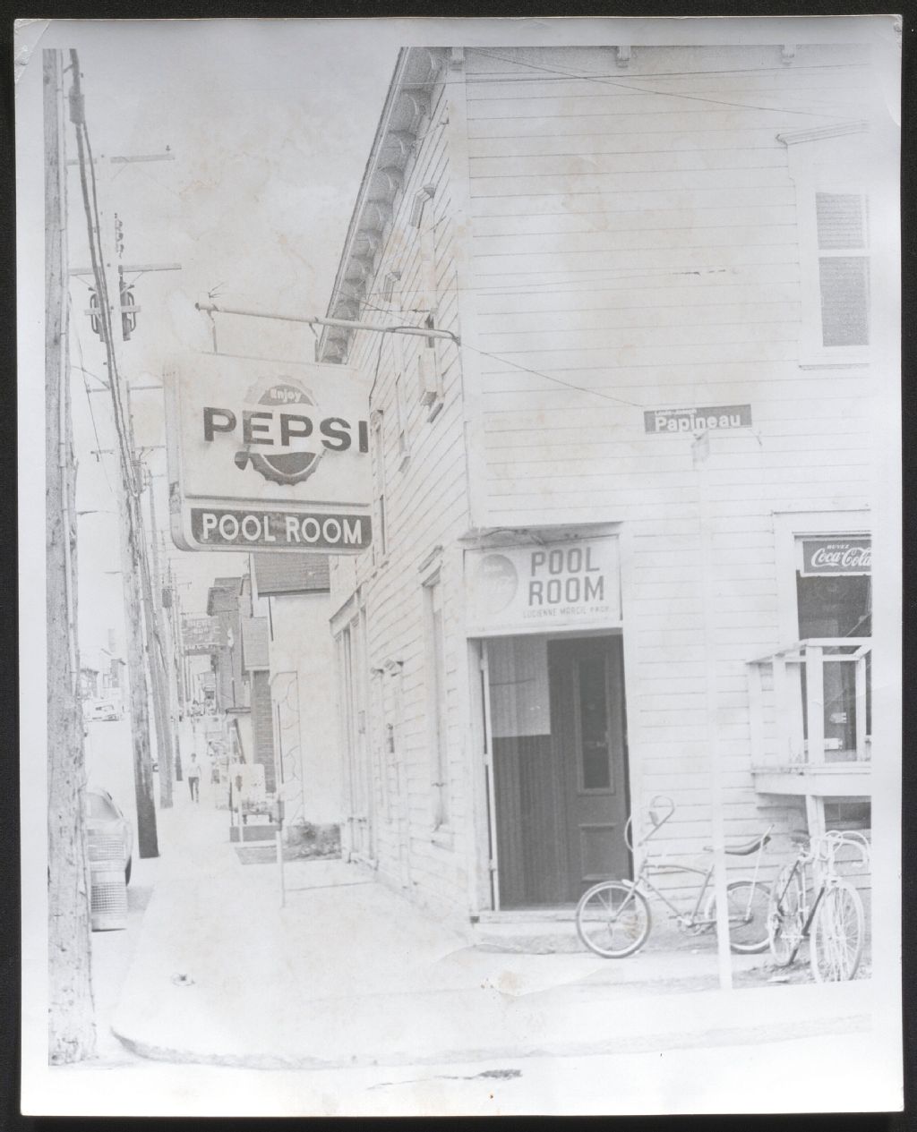 Photographie du bâtiment situé au 165 rue Eddy (à Hull) à l'intersection des rues Eddy et Papineau. Le bâtiment en question comprenait notamment la « Pool Room » ou salle de billard Marcil, alors propriété de Lucienne Marcil. Deux bicyclettes sont accotées près de la porte d'entrée de la salle de billard.