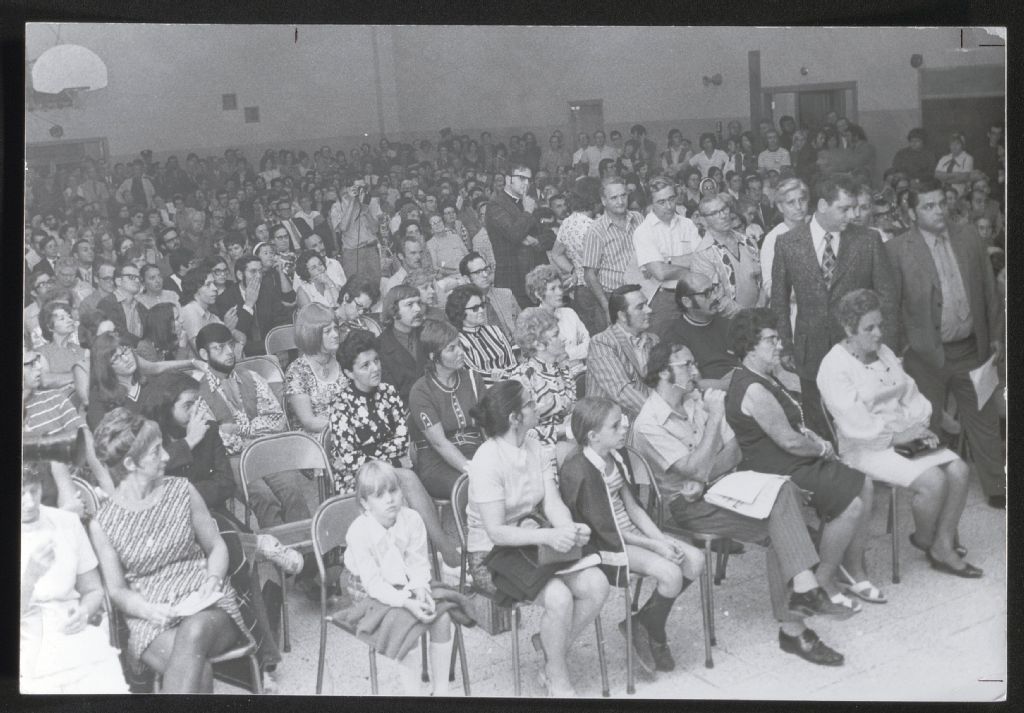 Rassemblement dans le gymnase d'une école, [1970-1977], Archives nationales à Gatineau, Fonds Roger Poirier, (07H,P134,S6,SS2,D1,P45), Photographe non identifié.